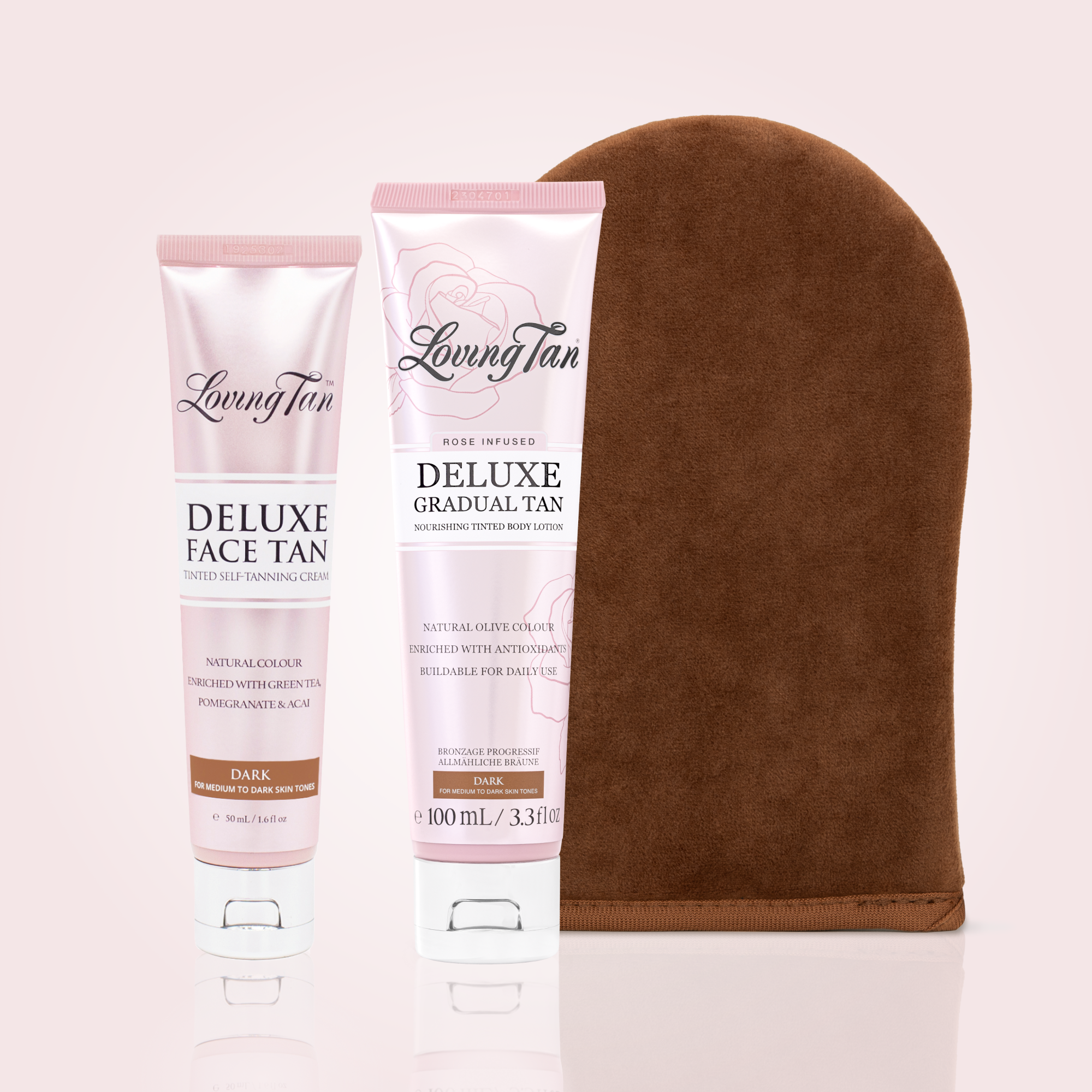 Included are the limited-edition Rose Deluxe Gradual Tan Dark for professional strength results, our Deluxe Face Tan Dark to enhance and extend your tan for over two weeks and our Applicator Mitt for a streak-free finish.